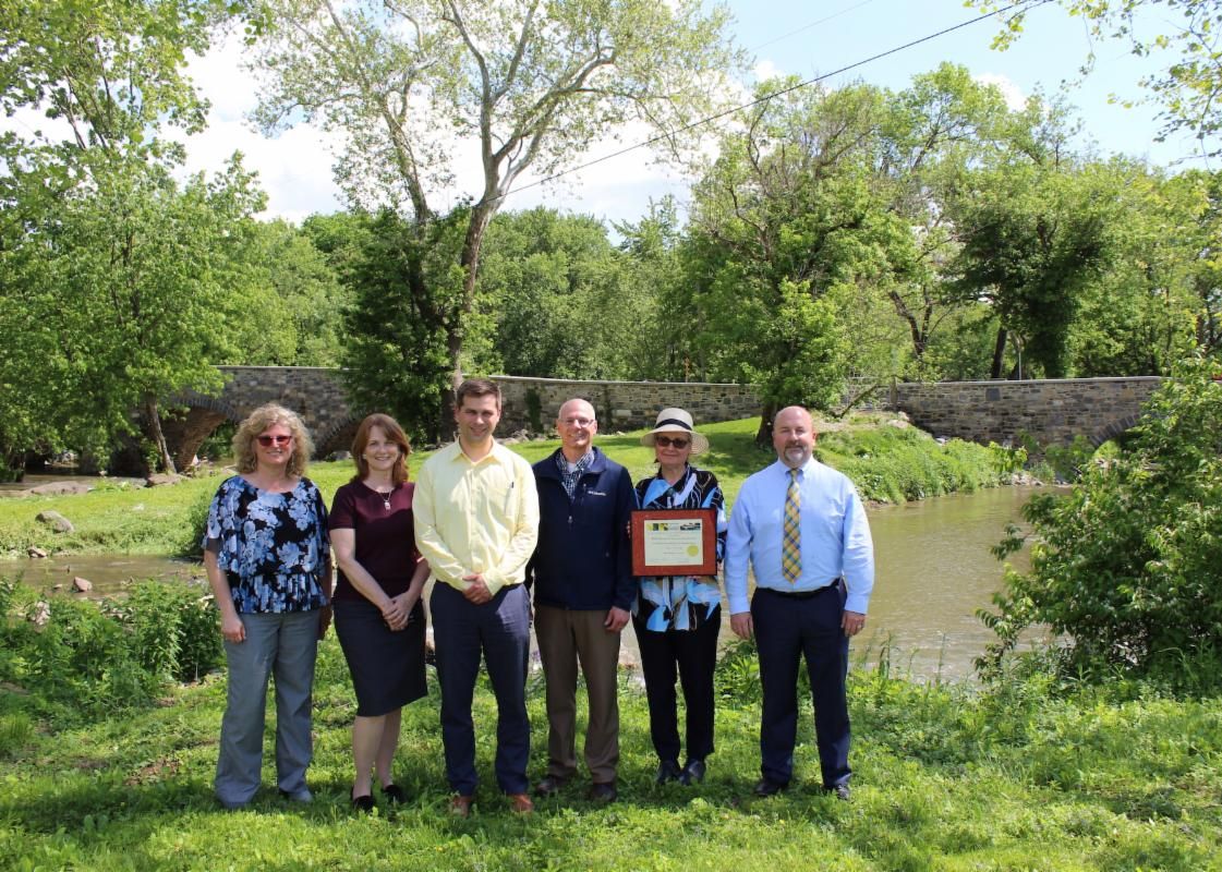 HAGERSTOWN, MD (May 20, 2022) – Washington County Government received a Maryland Preservation Award for Outstanding Stewardship by a Government Agency for the Claggett’s Mill Bridges by the Maryland Historical Trust on Thursday, May 19, 2022. The ceremony included awards given to Lantz Construction Company dba Building Systems as the general contractor, and Gruber-Latimer Restoration as the subcontractor responsible for the stone masonry repairs to the three-arch bridge, and one-arch bridge separated less than 100 feet apart. The Claggett’s Mill Bridges were built in 1840 and 1841, and have been identified as national historic structures. The bridge rehabilitation was a federal aid project designed by KCI Technologies, Inc., and managed by the Washington County Division of Engineering with oversight by the Maryland Department of Transportation State Highway Administration. Scott Hobbs, director for the Washington County Division of Engineering stated, "this marks the 10th stone arch bridge rehabilitation project in Washington County over the last 20 years".