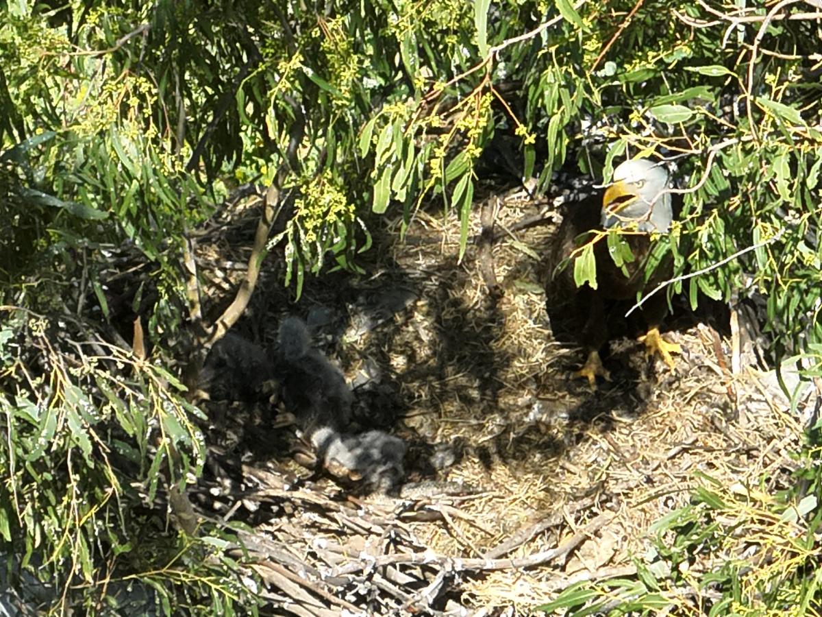 Three new eaglets have hatched in the nest of resident bald eagle pair Lucy and Ricky at the Prado Wetlands. The eaglets are estimated to be approximately three to four weeks old and are expected to remain in the nest for about 12 weeks before they are ready to take flight.