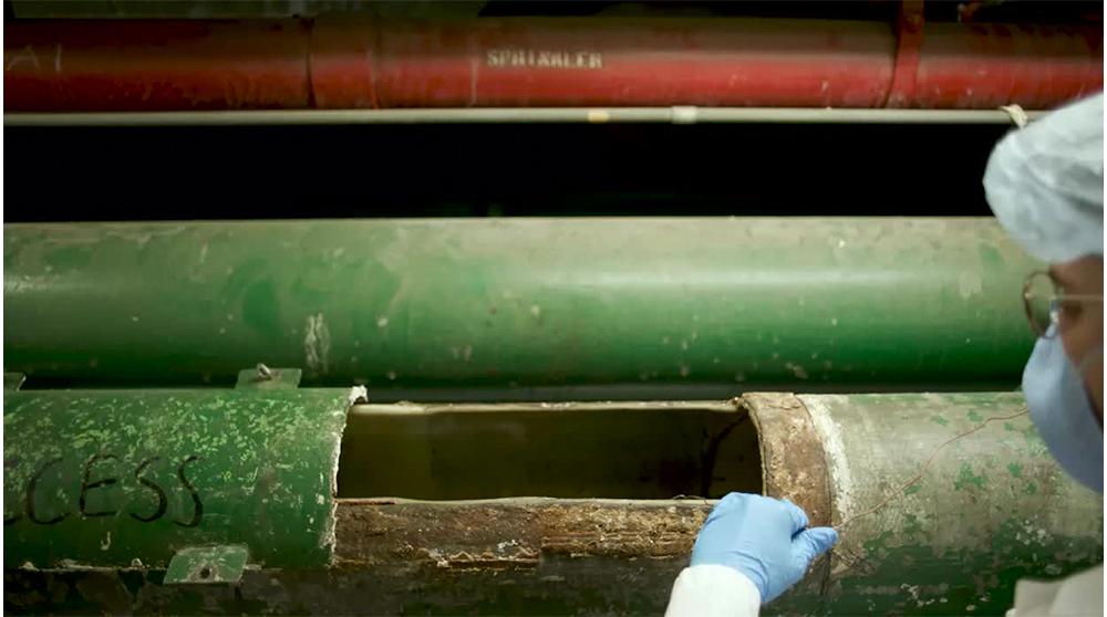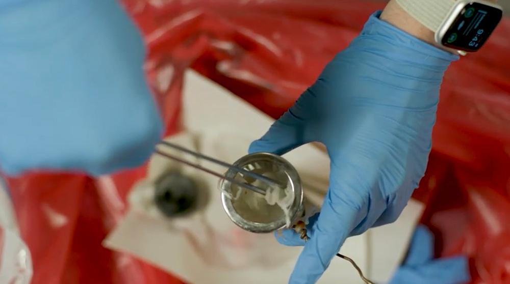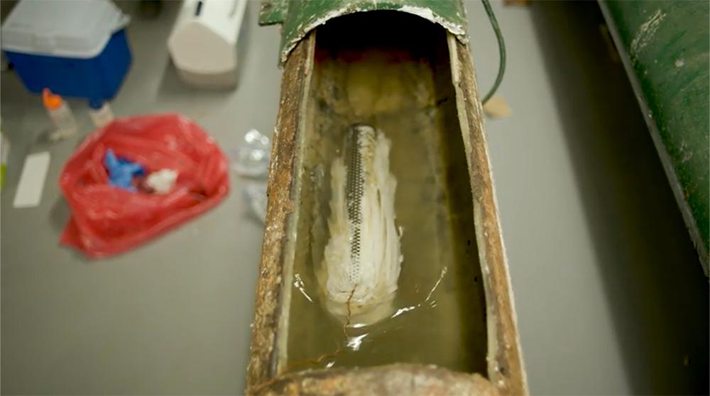Wearing masks and gloves, they carefully remove the device from the pipe and then use tweezers to extract a tampon – yes, a tampon – from the mesh tube.