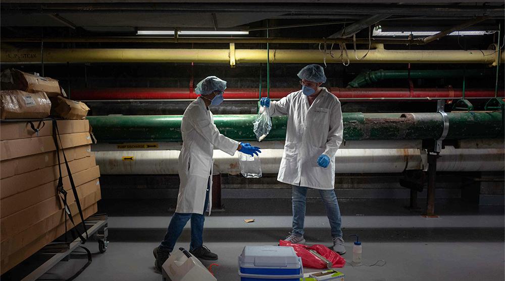 In which the toilets are flushed, sewage flows through a basement pipe and two intrepid scientists come to collect it.