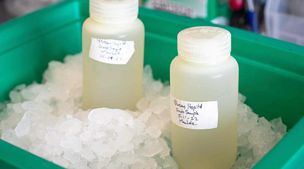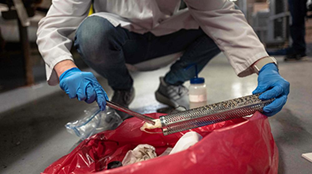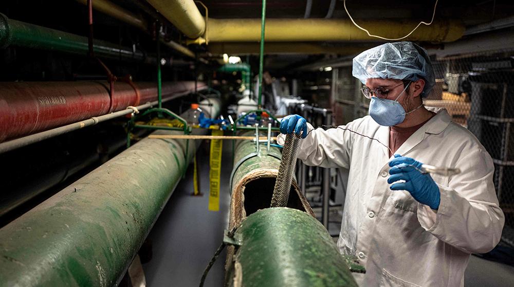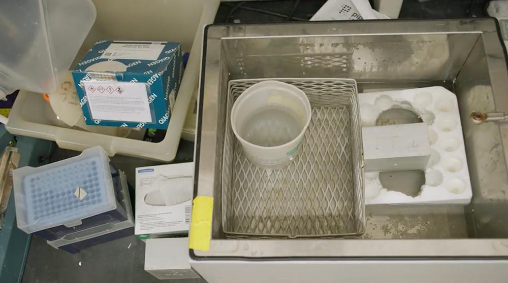 The sample is pasteurized in a hot water bath, making it safe for scientists to handle. Then, the water is filtered to remove solids and debris.