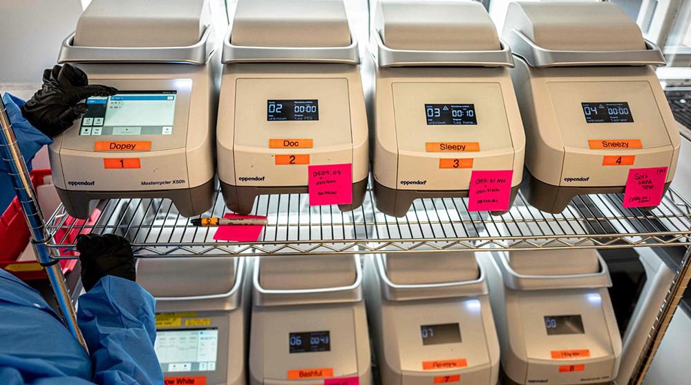 A pipetting robot adds the necessary chemicals and enzymes to a plate containing small amounts of the viral RNA. The plate is then placed into a thermal cycler – each one emblazoned with a Snow White-inspired name – and the enzymes convert the RNA into DNA.