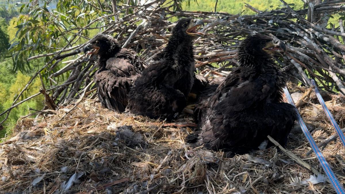 We’re excited to announce that three new eaglets have been born in the Prado Wetlands, home to resident bald eagles Lucy and Ricky. The eaglets, now about nine weeks old, were banded on April 9 by a wildlife biologist, allowing researchers to