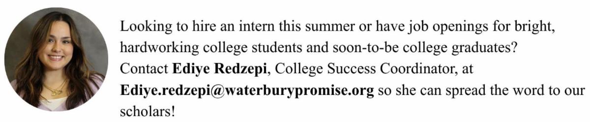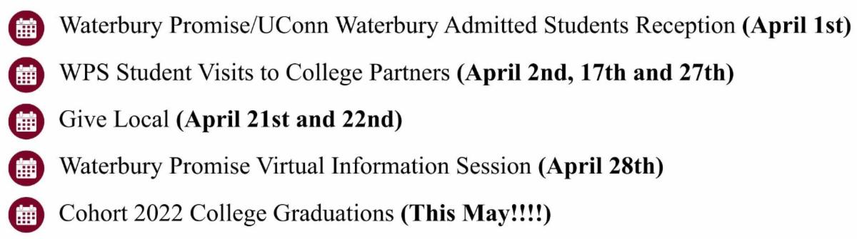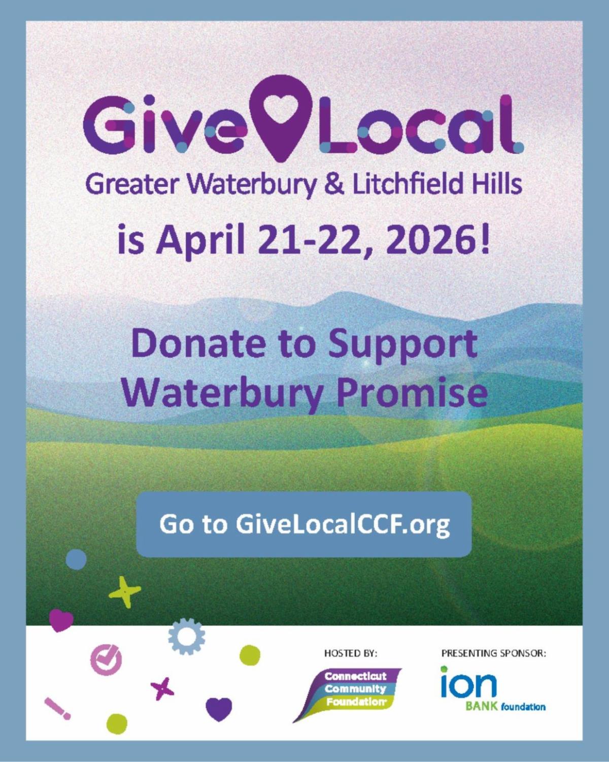 | | MARK YOUR CALENDARS! Waterbury Promise is gearing up to participate in the Connecticut Community Foundation’s 14th annual Give Local campaign on April 21st and 22nd and we need your help to raise more than $30,000 during this exciting 36-hour online fundraising blitz. We are eternally grateful to LaBonne’s Markets for signing on as a matching sponsor to double the dollars we raise—and our impact! Watch for more details in the coming weeks. We hope you’ll add us to your Give Local shopping cart when the big day comes! | Let's continue to work together to make a BIG impact for our scholars and the Waterbury community! | | Contact Hedy Ayers, Director of Development and Community Engagement for more information at hedy.ayers@waterburypromise.org. | | Thank You to Our Founding Champions, Community Partners, Partnering Colleges & Universities and Donors! | | Thank you to our major and individual donors! Your generosity is changing the lives of Waterbury students every day! | | THANK YOU ALL FOR YOUR SUPPORT! | | Follow us on social media! | | Established in late 2021 in collaboration with the City of Waterbury and Waterbury Public Schools, Waterbury Promise is a 501(c)3 nonprofit organization dedicated to building a generation of college graduates in Waterbury. Our mission is to increase college aspirations, reduce financial barriers and inspire every student toward post-secondary education and completion. The program’s comprehensive college success model provides a generous last-dollar scholarship as well as critical support services to help talented Waterbury students get to college, thrive there, persist through graduation and be career ready to help create a robust and diverse talent pipeline for the local economy. | | | | |