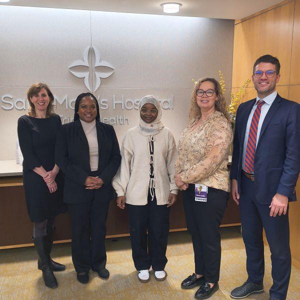 | | From left to right:Hedy Ayers, Waterbury Promise's Director of Development and Community Engagement, Kelonda Maull, Waterbury Promise’s Executive Director, Hauwa Mahe, Waterbury Promise Plus Program mentee, Shawna Edwards, DNP, MSN, RN, Chief Nursing Officer of Saint Mary's Hospital, and Robert Roose, MD, MPH, President of Saint Mary’s Hospital | | |