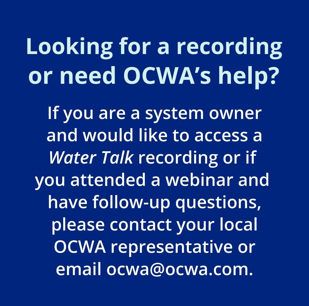 If you have questions or would like to talk about what these changes mean for your system, please reach out to your local OCWA representative or email ocwa@ocwa.com.