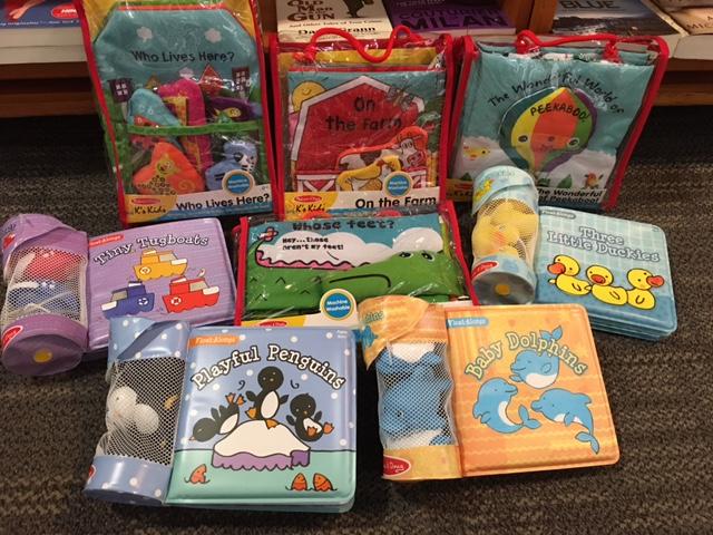 Machine-washable cloth books are perfect for the babies you are shopping for. Float-Along books come with sweet little bath toys and a great bath-time story.