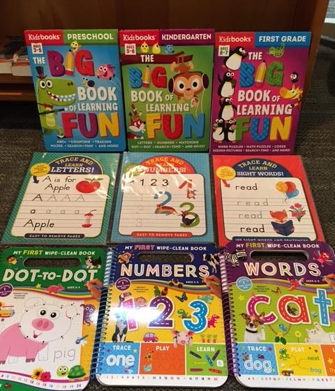 We have all kinds of activity books--My First Wipe Clean books, Trace and Learn books, and the Big Book of Learning Fun for several ages.