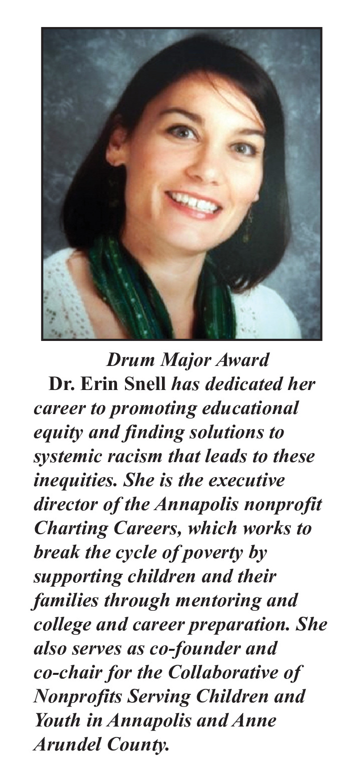 Erin is the recipient of the prestigious 2021 Dr. Martin Luther King, Jr. Drum Major Award (presented by the MLK Jr. Committee of Anne Arundel County) for her exemplary work with Charting Careers, as well as her advocacy and collaborative efforts across our community. Erin works tirelessly to break the cycle of poverty and inequity in Annapolis through mentoring, college and career readiness, family partnership, and leadership for equity.
