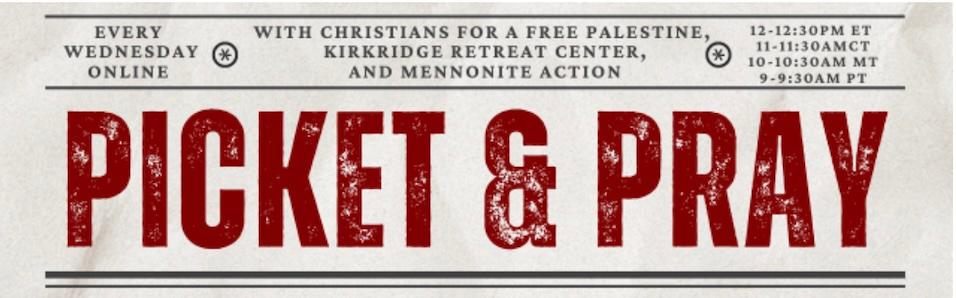 Every week on Wednesdays, CFP joins with our partners at Mennonite Action and Kirkridge Study and Retreat Center for shared spiritual practice and action for Palestine. Will you join us tomorrow? Whether you participate in Picket & Pray every week or this will be your first time, we welcome you!