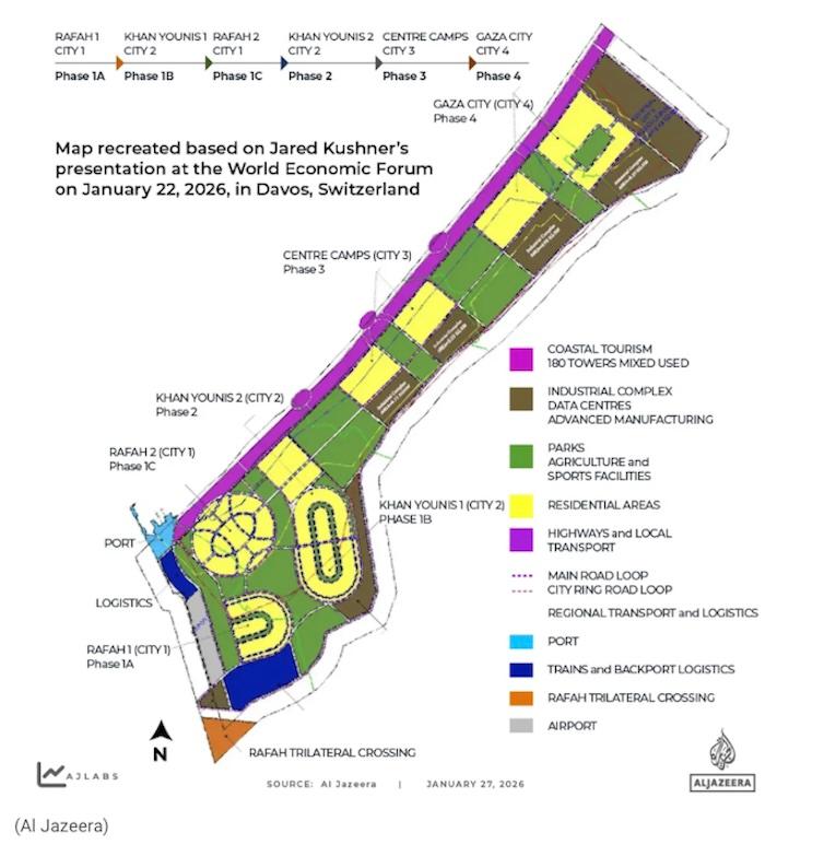 At the World Economic Forum last week in Davos, Switzerland, Jared Kushner, a real estate developer and son-in-law of United States President Donald Trump, unveiled a “master plan” for post-war Gaza during a presentation.