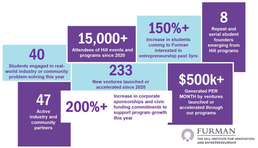 That’s what The Hill Institute is all about. Not just programs or pitch nights, but people. Creating spaces where curiosity is encouraged, risks are celebrated, and ideas are given room to grow. This year, we watched that happen across campus and throughout the Greenville community, and it’s something we don’t take for granted.