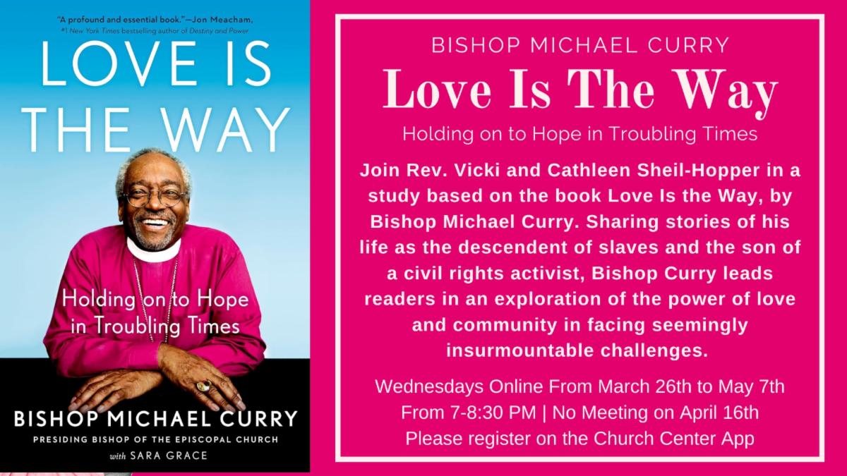 Join Rev. Vicki and Cathleen Sheil-Hopper in a study based on the book Love Is the Way, by Bishop Michael Curry. Sharing stories of his life as the descendent of slaves and the son of a civil rights activist, Bishop Curry leads readers in an exploration of the power of love and community in facing seemingly insurmountable challenges. Now retired, Bishop Curry was the first African American bishop of the Episcopal Church. The group meets on 6 Wednesday evenings: March 26; April 2 and 9: