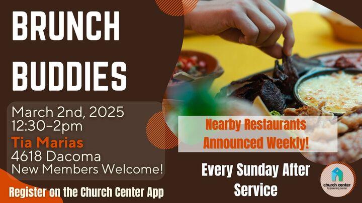 Join us after service for in-person Brunch Buddies, Sunday, March 2nd, after service at Tia Marias, 4618 Dacoma St. View MENU. | |