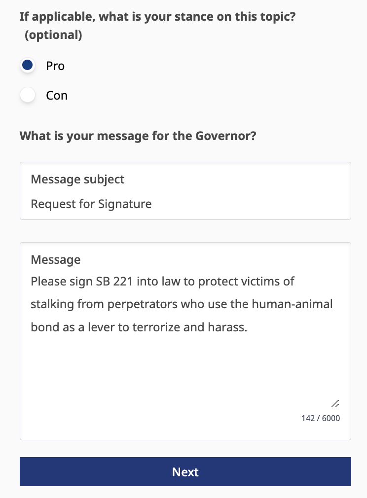 Last year, the Riverside County DA brought the idea for this legislation to the Senator after they had several cases which they could not prosecute for criminal stalking because the threats made by the perpetrator were focused on the pet of their victim, not directly at them or their human family members which is required under the current law. Sadly, in one of these instances the victim's pet was later found killed. The bill ultimately died in the Assembly Public Safety Committee.