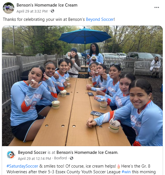 Here's the Gr. 8 Wolverines squad after their 5-3 ECYSA #win in April. Long-time #CoachMentor Melissa, who always goes #beyond for her players (mainly because she was a former player), said their solid team effort, especially their improved communication, motivated her to take them for a Benson's Homemade Ice Cream. Benson's liked the post so much that they shared it!