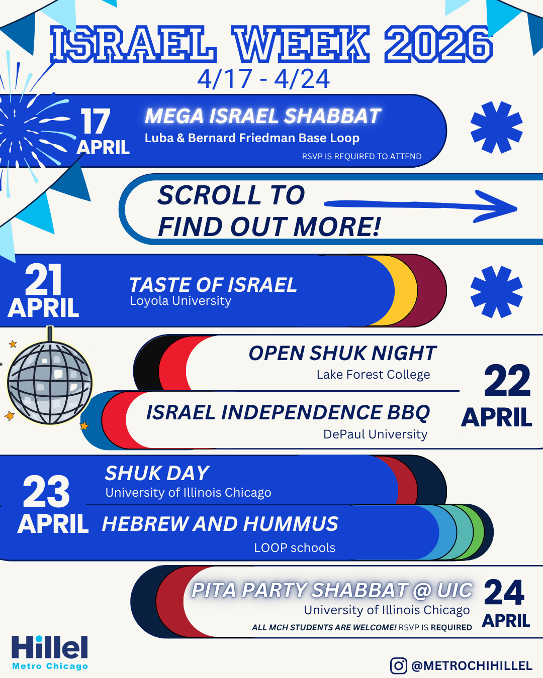 With this spirit in mind, Rav Ezra and our Israel Fellow Roni will be kicking off the festivities with "Mega Israel Shabbat" tonight at Luba and Bernard Friedman Base Loop. All MCH students are free to join and enjoy an Israeli-themed Shabbat dinner!