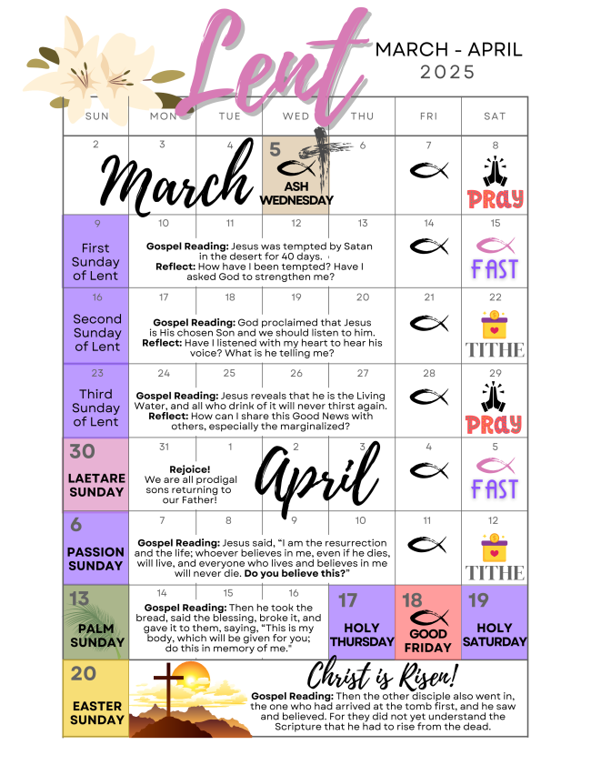 The Lenten season is a time of reflection, repentance, and spiritual renewal. This Lenten calendar is filled with opportunities for spiritual growth that help enhance our journey during this sacred period. This calendar serves as a guide, encouraging daily reflections and actions that deepen our connection to God and our understanding of scripture.