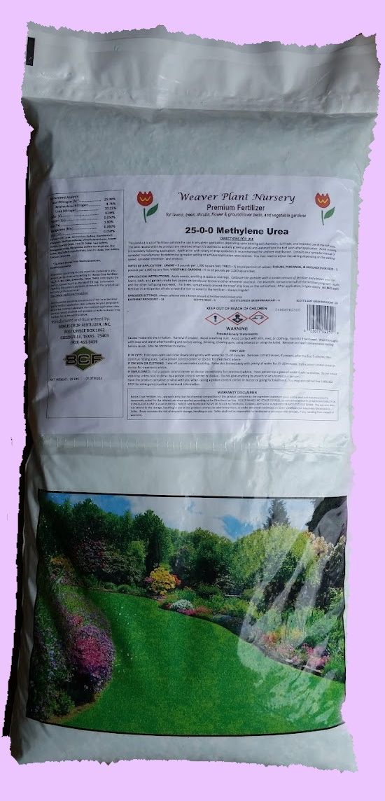 Packaged in 20 pound bags Weaver Plant Nursery Premium Fertilizer is available in a 25-0-0 and a 24-6-12 analysis. Both formulations have 60% of the nitrogen in slow-release form. The all nitrogen formulation is used on soils having excessive phosphorous (typically clay soils), and the 24-6-12 formulation is used on soils that need additional phosphorus. Both analyses are suited for use on lawns, trees, shrubs, and gardens. Each bag will cover 4,000 to 5,000 square feet.