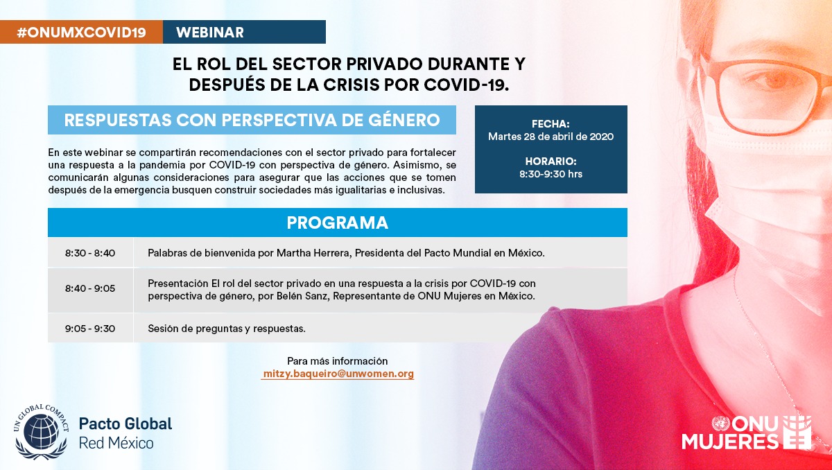 Tenemos el gusto de invitarles al Webinar "El rol del sector privado durante y después de la crisis por COVID-19". Respuestas con perspectiva de género, organizado en conjunto por ONU Mujeres en México y Pacto Mundial México.