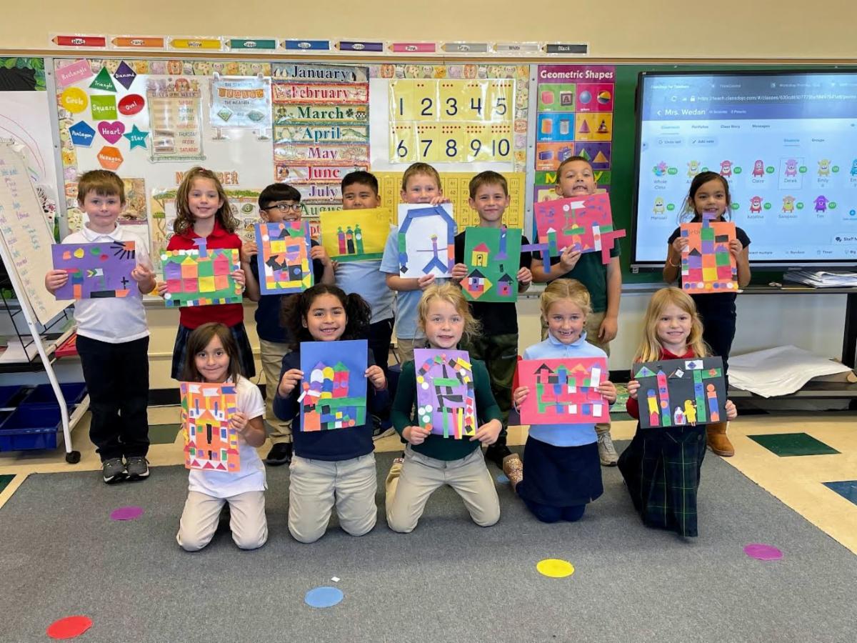 First Grade In Touch with the Arts students showing off their Alexander Girard-inspired art