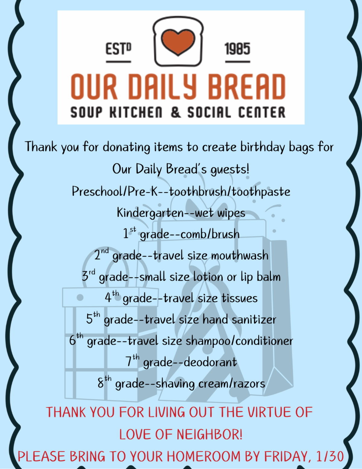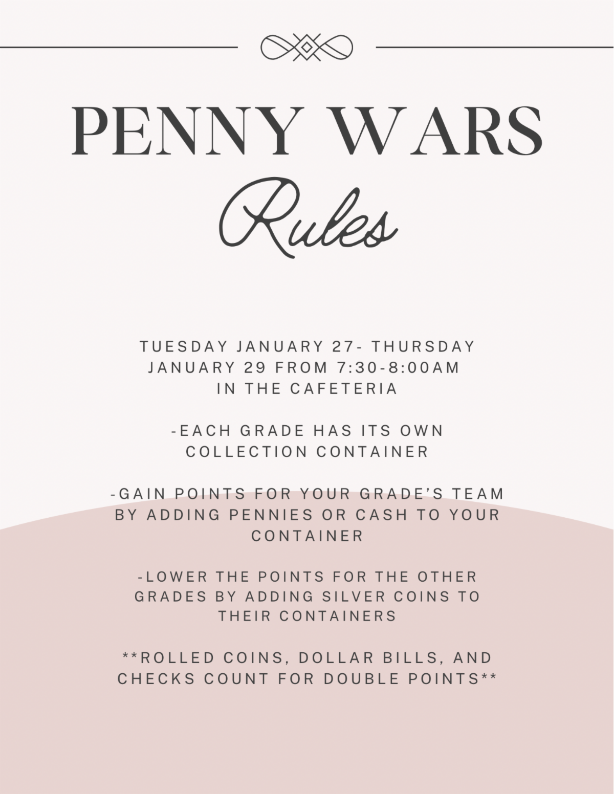 Start saving those coins! Our annual Penny Wars is coming up during Catholic Schools Week. It will run from Tuesday 1/27 - Thursday 1/29.