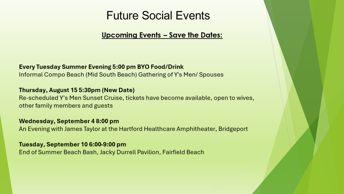 Videos of all 2024 meetings are now available on the Y's Men website (ysmenwestportweston.org). Then click on the “Meeting Photos & Videos” tab. | |