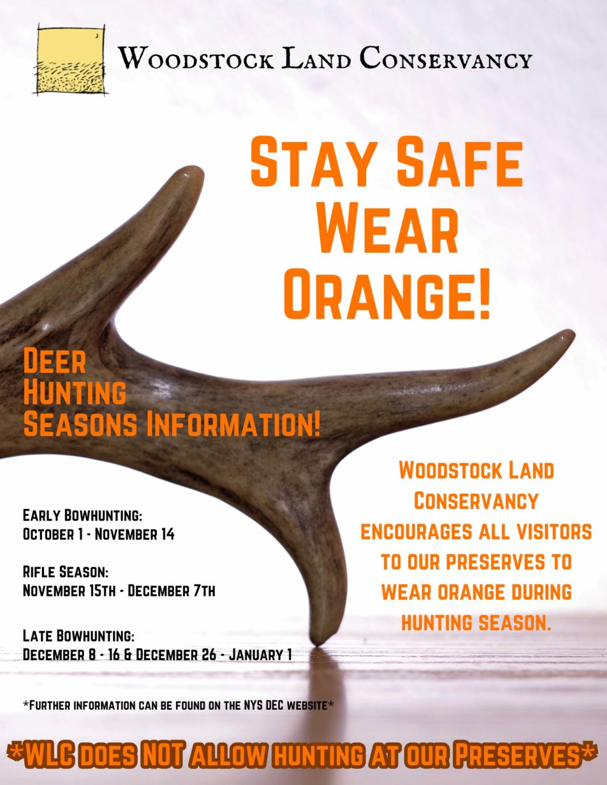 Though absolutely no hunting is allowed at any of the Woodstock Land Conservancy preserves, we encourage you to consider wearing brightly colored and/or reflective orange clothing to ensure maximum protection while out in the woods. For detailed information about New York State hunting timelines, review this document for details.