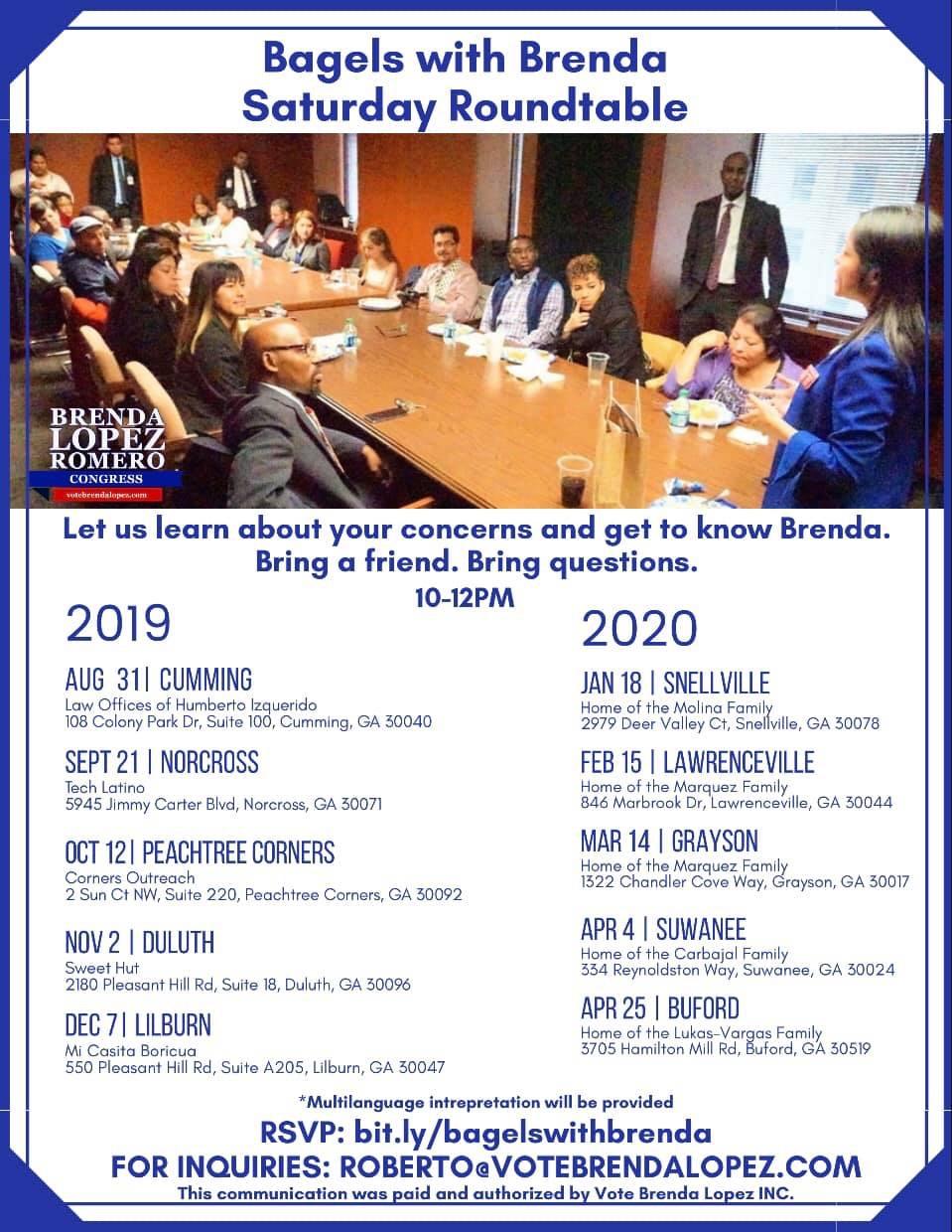 Join us for Bagels with Brenda once a month on Saturdays from 10am-12pm. This is a chance to personally meet Brenda to bring up the issues that concern you most. Bring a pen, a friend, and those burning questions about the issues in your community. The first meeting will be held this Saturday, August 31, 2019  at  108 Colony Park Dr. Suite 100 Cumming, GA 30040.  We are excited to see you there!