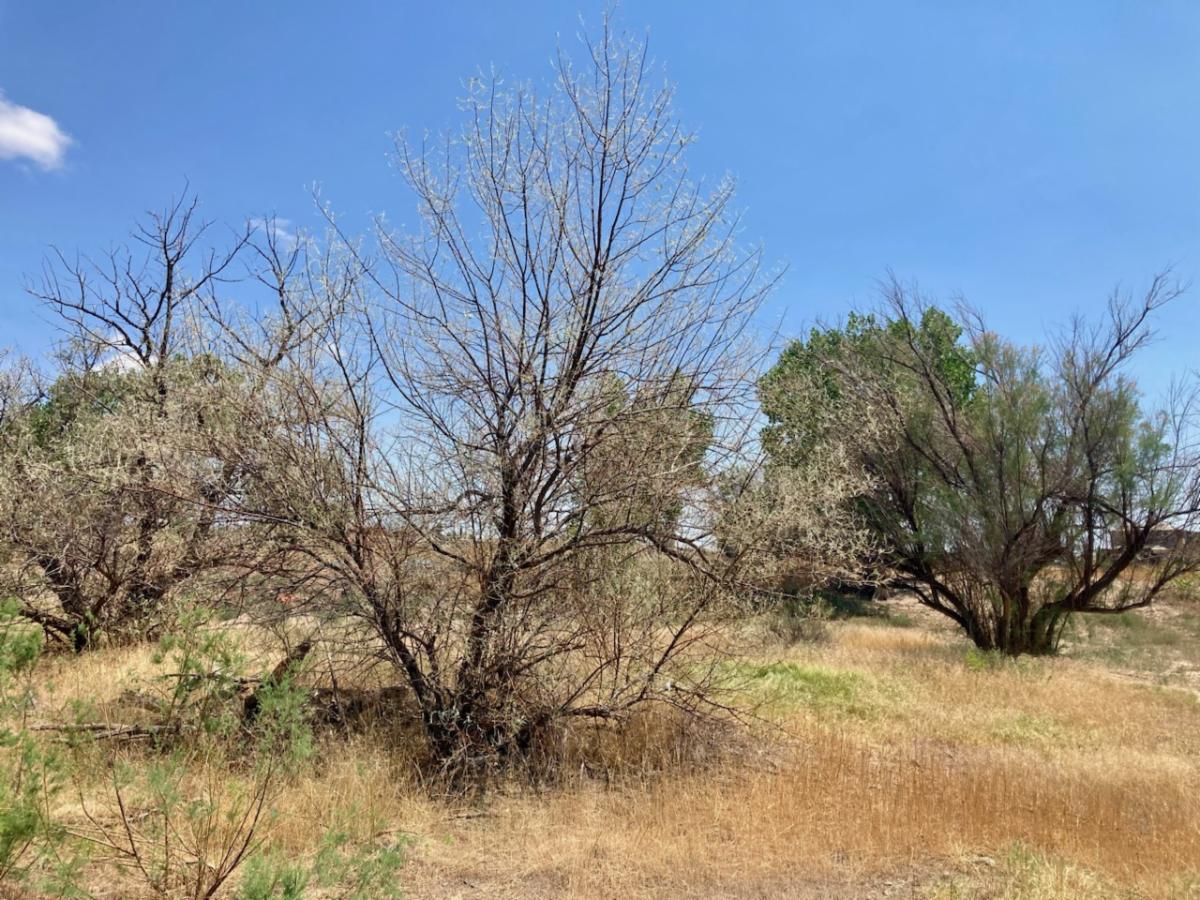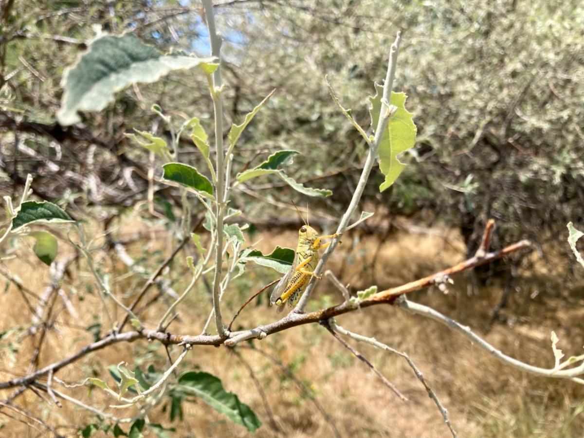 | | | | Grasshopper damaged Russian olive & Tamarisk, note undamaged cottonwood in background (top) Closer view of Russian olive damage (left middle) Closer view of tamarisk damage (bottom left) dished-out flower head of Scotch thistle (Right) | | Photo Credits: C. Bryant (2025) | | A direct and compelling headline | | |