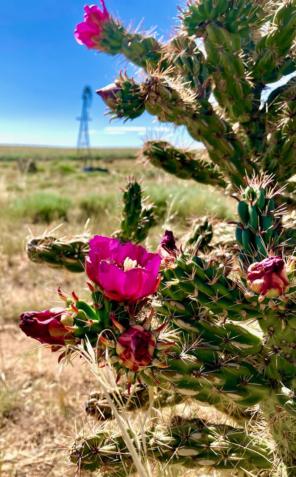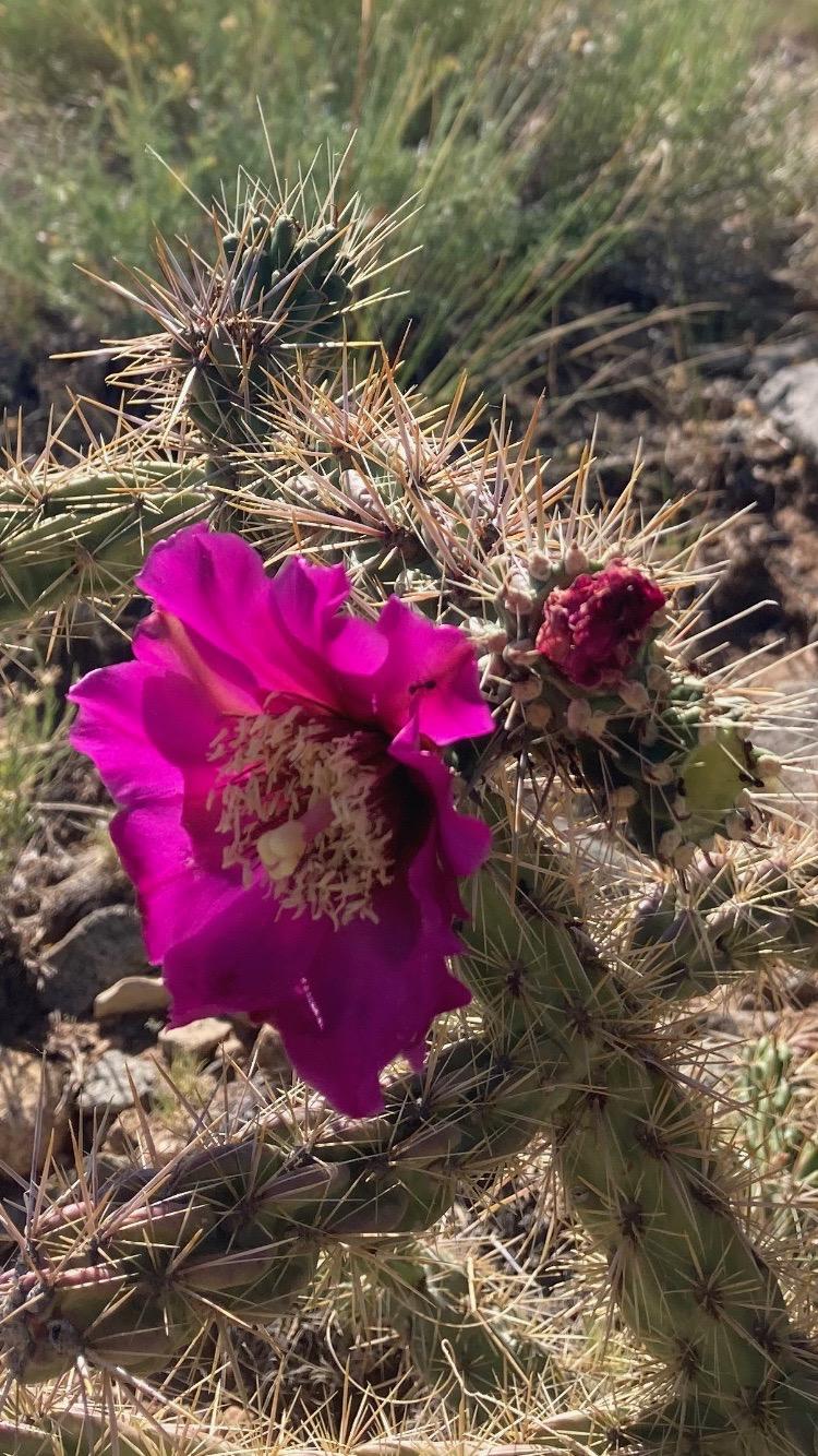 The cane cholla, also called the “walking stick cholla” (Cylindropuntia imbricate) is a native cactus species that is widely distributed in the arid shortgrass prairies of Colorado and surrounding southwestern states. Favoring altitudes between 3,900 ft to 7,500 ft, cholla cacti are often one of the most conspicuous plants visible in our prairie\desert landscapes, growing to a height up to eight feet with vibrant magenta flowers, though most cholla encountered in the field are 2-5 feet in height. The highly branched cylindrical stems have sturdy clusters of 1”+ spiny thorns along their length, while the yellowish-green fruits that form on the ends have many smaller spines only around one millimeter in length. The spiny fruits produced by cholla remain intact throughout the year, providing valuable forage for pronghorn, deer and rangeland cattle alike.