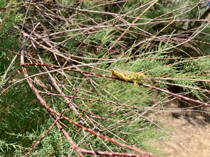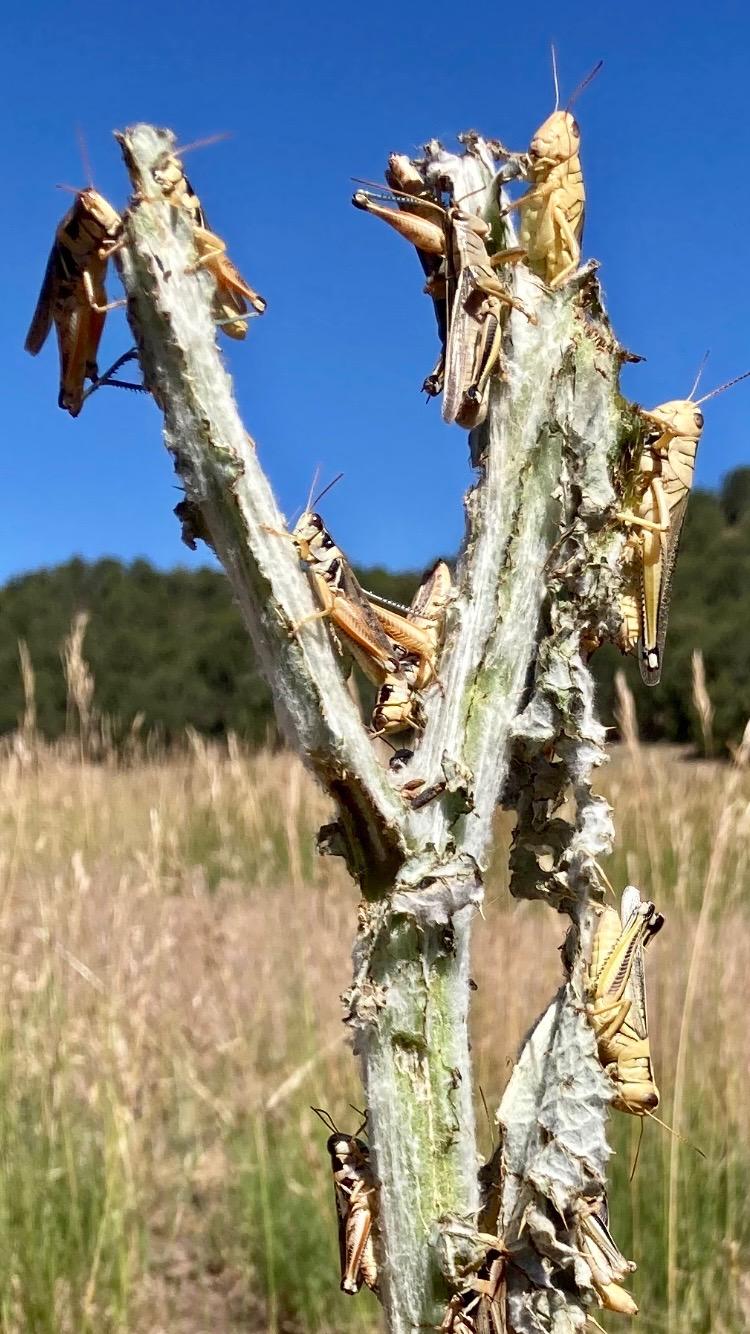 So why have these noxious species in only certain areas been on the menu for our unwanted seasonal weed warriors? Answer: plant volatiles. Much like the manner in which Diorhabda (salt cedar) beetles are steered, so do our native grasshopper species. For the Scotch thistle to be selected for first it is likely due to the high amount of terpenoids, green leaf volatiles and floral volatiles emitted that signal to the hungry swarms the quality of the food source. These chemical signals indicate everything from moisture and nitrogen content to the concentration of natural repellant compounds like alkaloids.[i] With Scotch thistle emitting the highest amount of VOC’s that facilitate the aggregation of grasshoppers while possessing the least amount of repellant VOC’s, Scotch thistle was first to be targeted, followed by Russian olive that still possesses favorable VOC’s, but possess slightly more repellant VOC’s. Our tamarisk trees were more so used as a last resort ration; given their higher amounts of repellant compounds, lower emissions of aggregation compounds, salt content and lower moisture content, basically being a can of Spam compared to the filet mignon quality of Scotch thistle, Russian olive and other more favorable forms of vegetation.[ii]