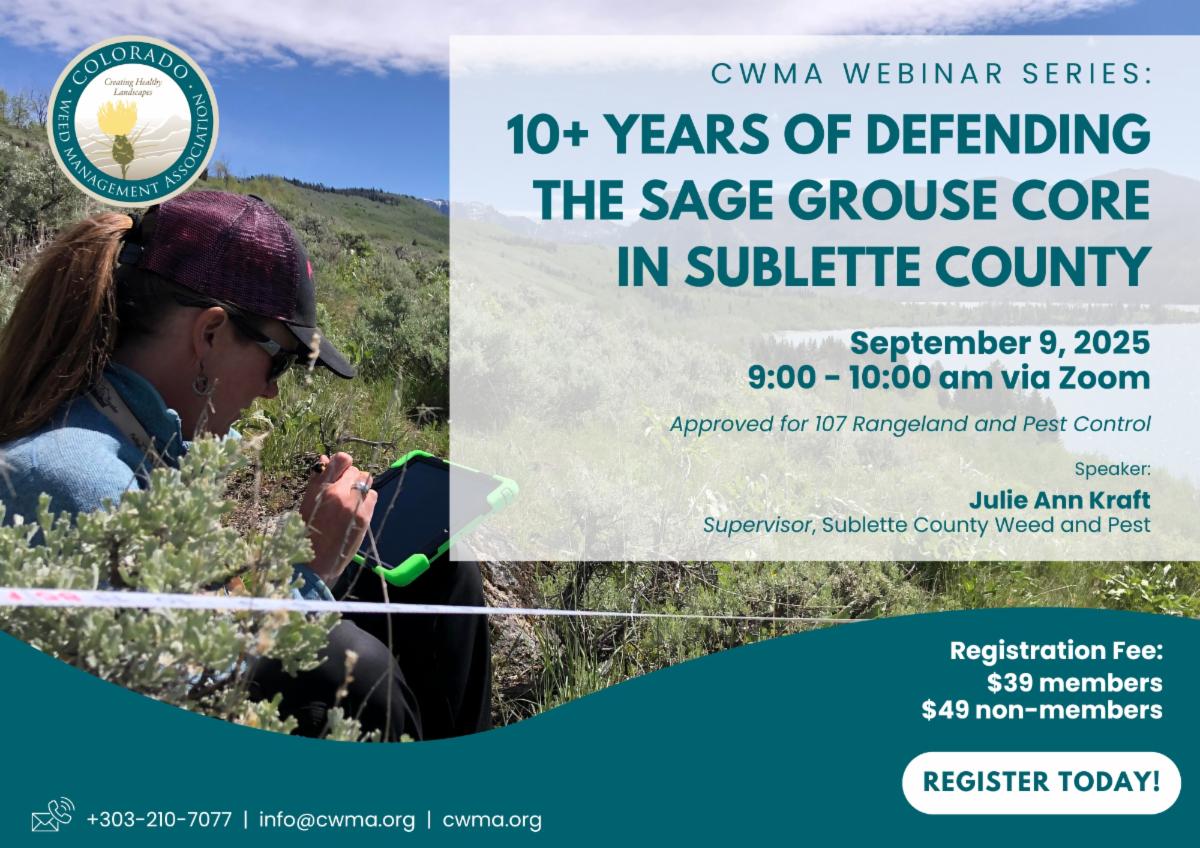 Join the CWMA Webinar Series for “10+ Years of Defending the Sage Grouse Core in Sublette County”! Discover how Sublette County Weed and Pest has tackled the challenge of managing invasive cheatgrass at a landscape scale since 2011—with more than 100,000 acres of aerial treatments.