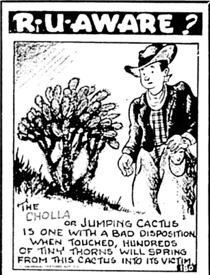 In Australia, both humans and animals have been slow to adapt to this relatively new spiny invader, with most literature bemoaning the prolific thorns found on nearly all portions of the plant. In the arid southwestern United States though, both animals and humans have found ways to contend with, and in some cases, literally embrace its sharp texture. For example, Texas A& M University has reported that cattle accustomed to feeding on cholla have developed grazing techniques where they will deliberately rub the thorns off of chola prior to feeding on it to make it more palatable. It even found a role in religious ceremonies among the Penitentes who willingly tied it upon their backs, then crushed it upon their skin under large wooden crosses that they carried during Holy Week processions. But perhaps the most entertaining use is the anecdotal “rattlesnake death trap” of our native bird speceis Geococcyx californianus, a.k.a., the roadrunner. Read about the “Dread of Rattlesnakes” and the culinary uses of roadrunners below….