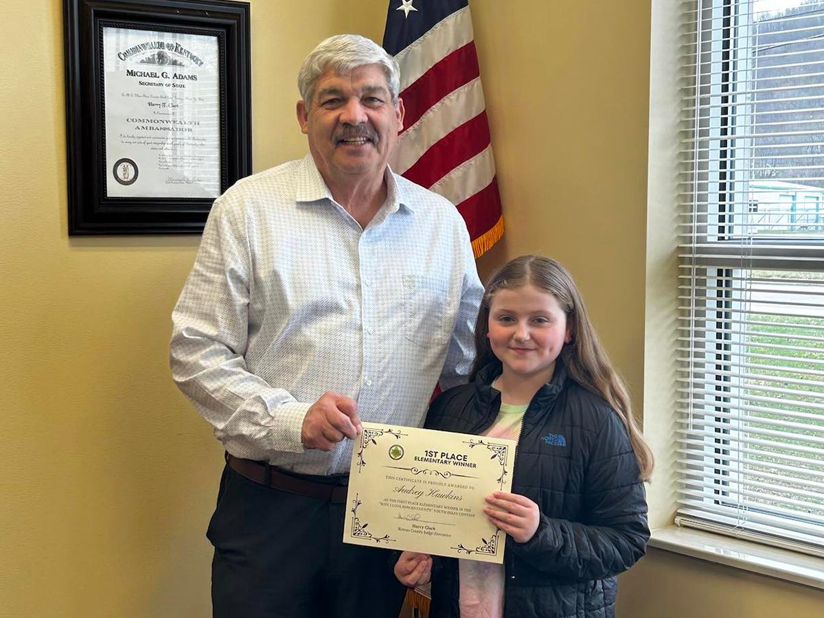 Rowan County Fiscal Court held its first “Why I Love Rowan County” Youth Essay Contest recently. Pictured with Judge/Executive Harry Clark is elementary school winner, Audrey Hawkins. All the winners will read their essays at the April fiscal court meeting. | |