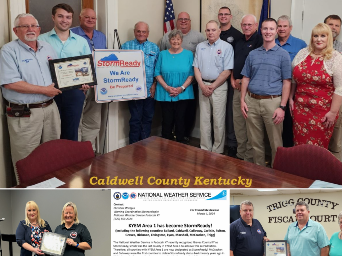 With the recent addition of Graves County, KYEM Area 1 is the only complete area in Kentucky to hold the StormReady accreditation that signifies a significant step in community preparedness for hazardous weather. Counties in this area include: Ballard, Caldwell, Calloway, Carlisle, Fulton, Graves, Hickman, Livingston, Lyon, Marshall, McCracken and Trigg. | |