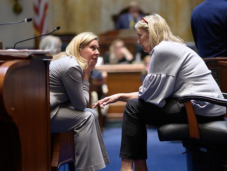 From LRC Public Information: Sen. Amanda Mays Bledsoe (left) confers with Senate Majority Caucus Chair Julie Raque Adams on the Senate floor Thursday. | |