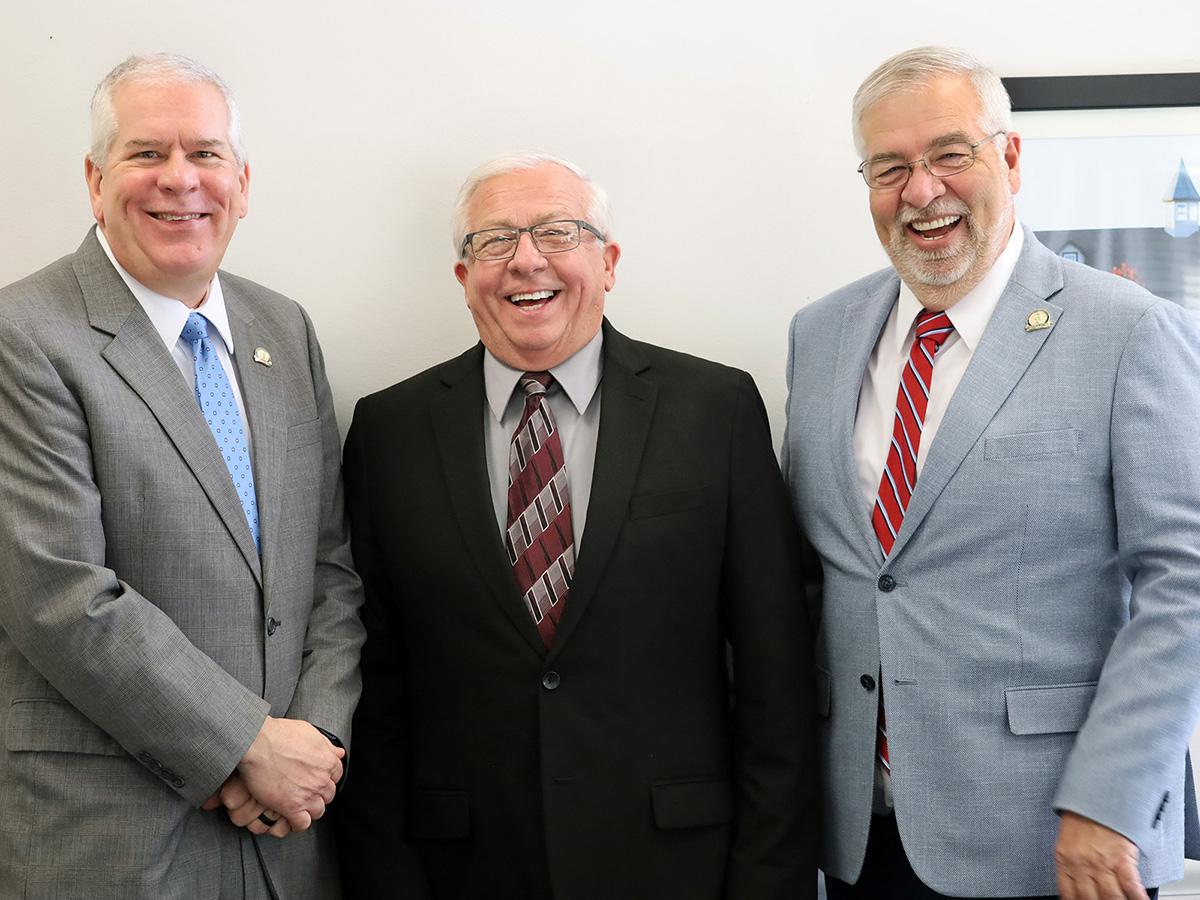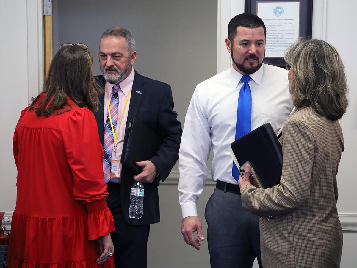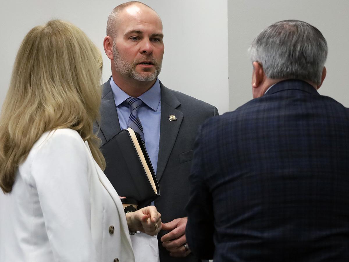 Rep. Jonathan Dixon, center, speaks with Jefferson County Circuit Court Clerk David Nicholson and KACo's Shellie Hampton | |