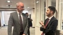 3/11/25 – Nevada State Senator Fabian Doñate and UNLV’s Officer in Charge Chris Heavey take a moment to visit with each other between hearings in the legislative building.