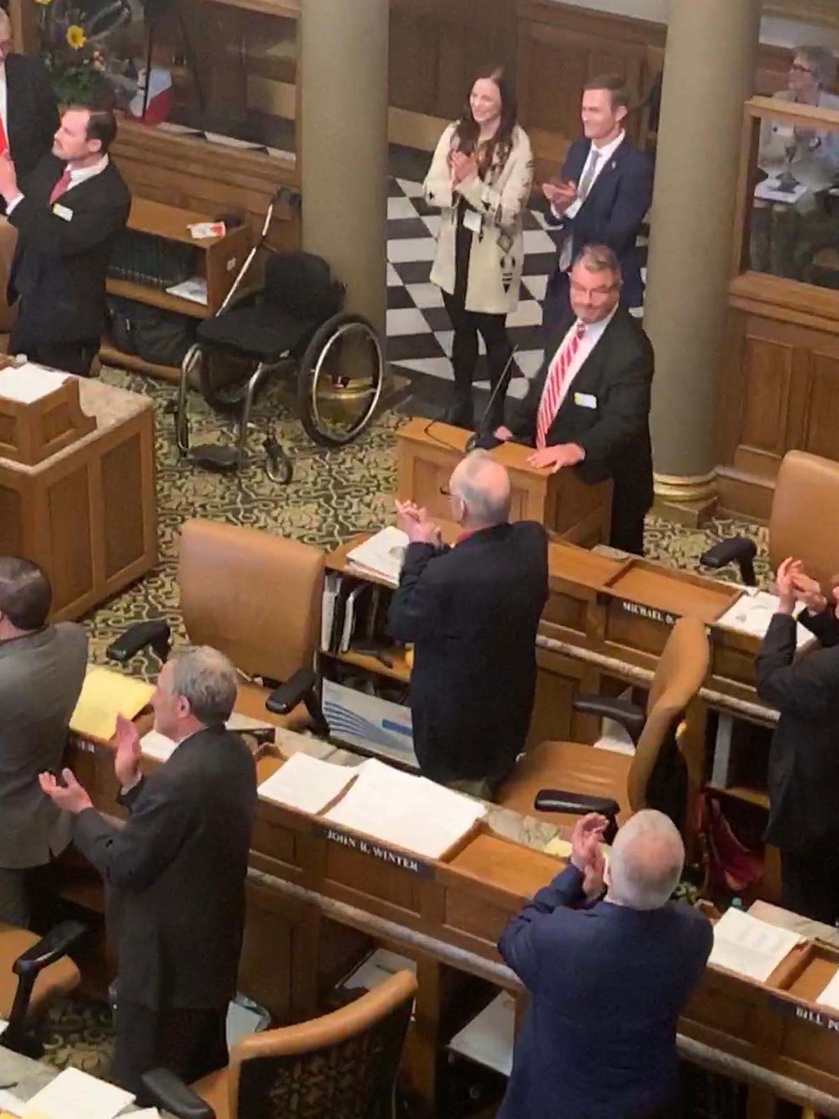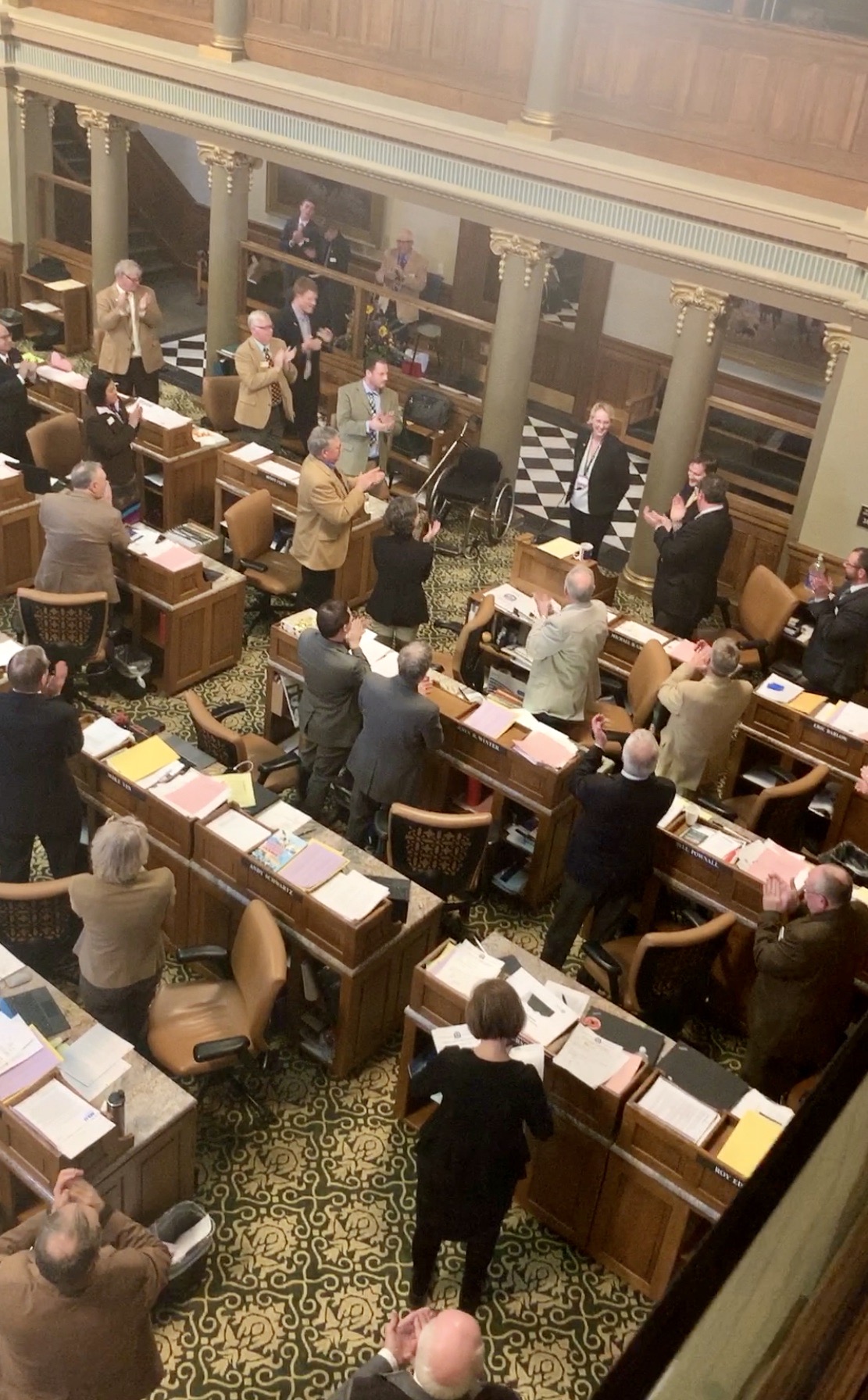 , receives a deserved standing ovation from the House floor for her heroic actions in taking care of a medical emergency in the House gallery.
