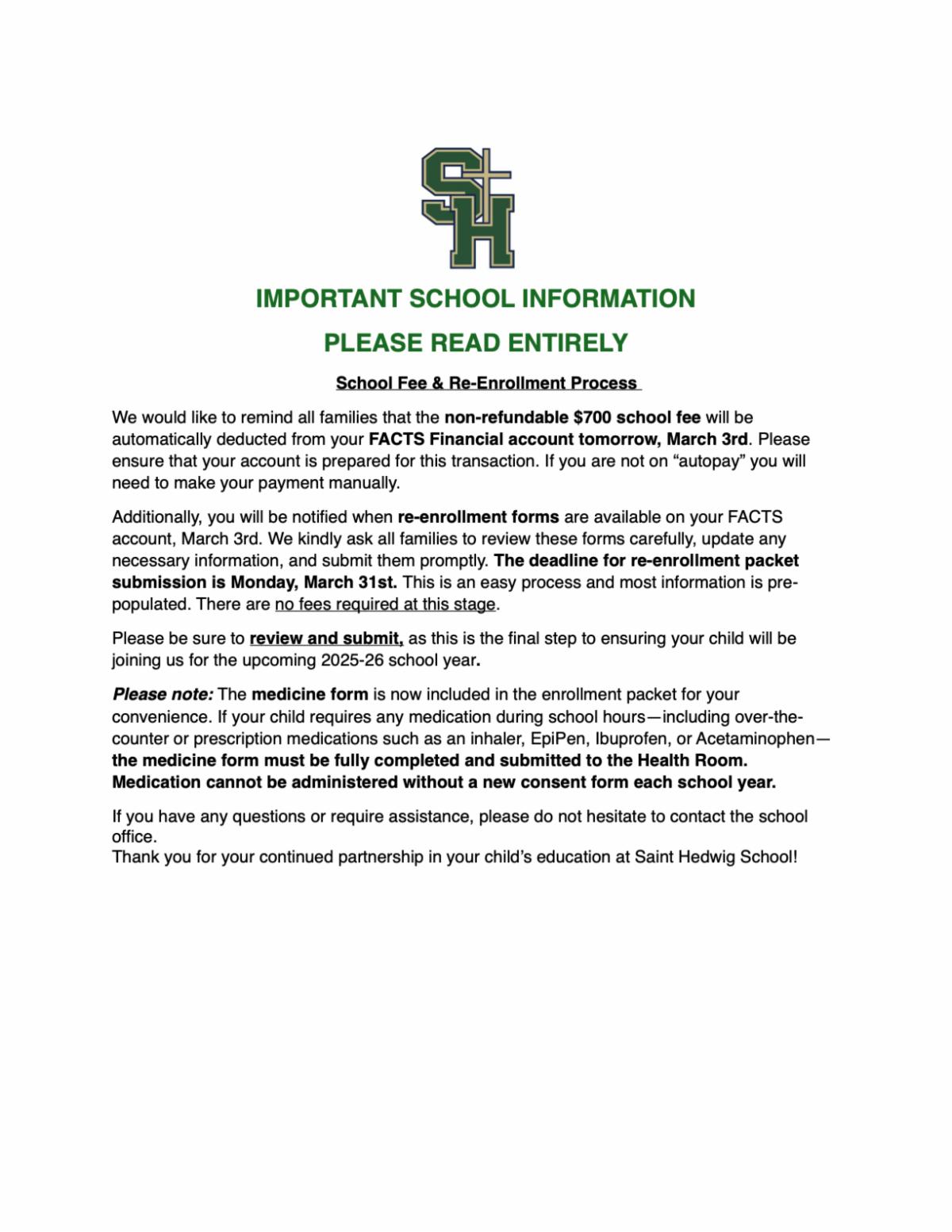 2025-2026 re-enrollment fee of $700 will be deducted on March 3rd.