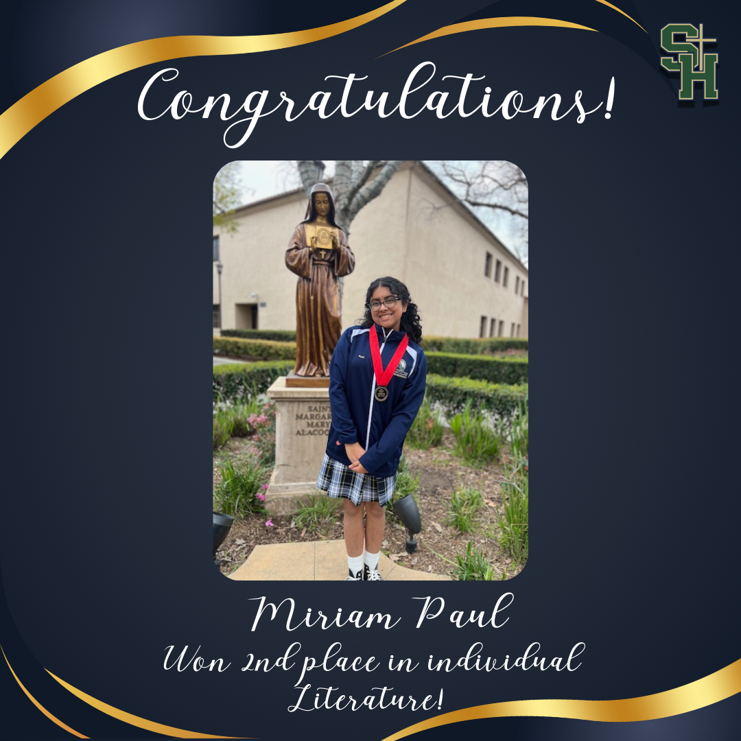 A special congratulations to Miriam Paul (7th grade) for winning 2nd place in Individual Literature!