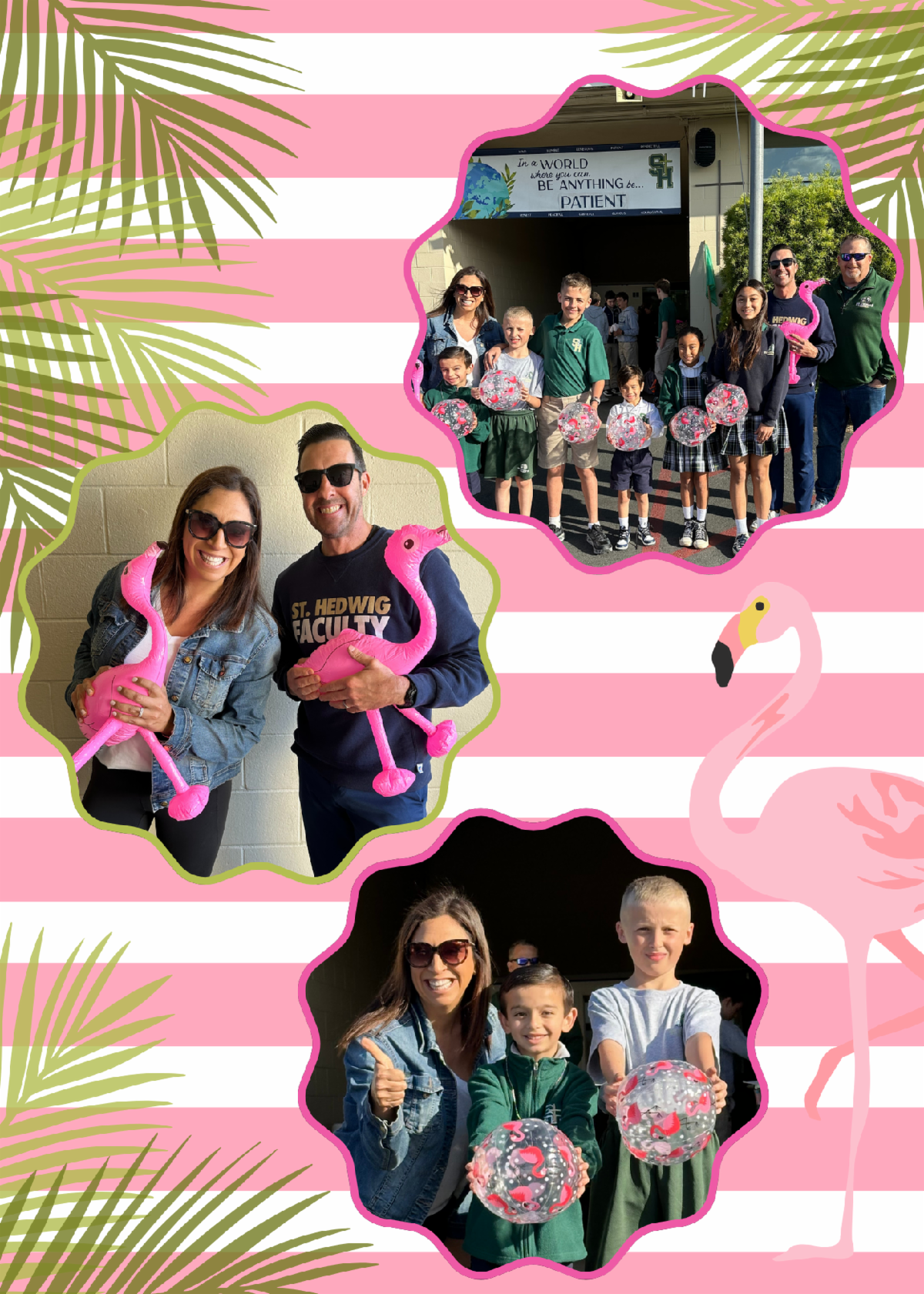 {We’ve introduced a new way for St. Hedwig students to get in on the auction fun. On Fridays, classes will be visited by Mr. McGuiness, Mr. Belisle, or Mrs. Vasquez, who will be making special deliveries of pink flamingo beach balls to all children of families who have purchased a Pink Ticket.