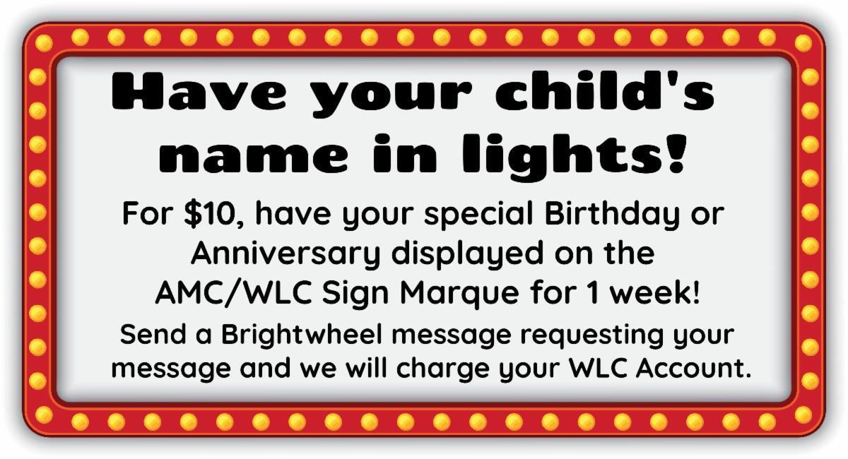 The WLC will post a Happy Birthday to your child on our electronic sign. The sign will run for one week for a $10 charge to your Brightwheel account. See the slide below or email Darla at darlajanak@gmail.com to sign up.