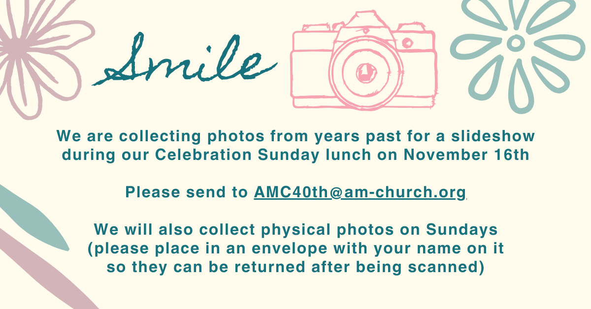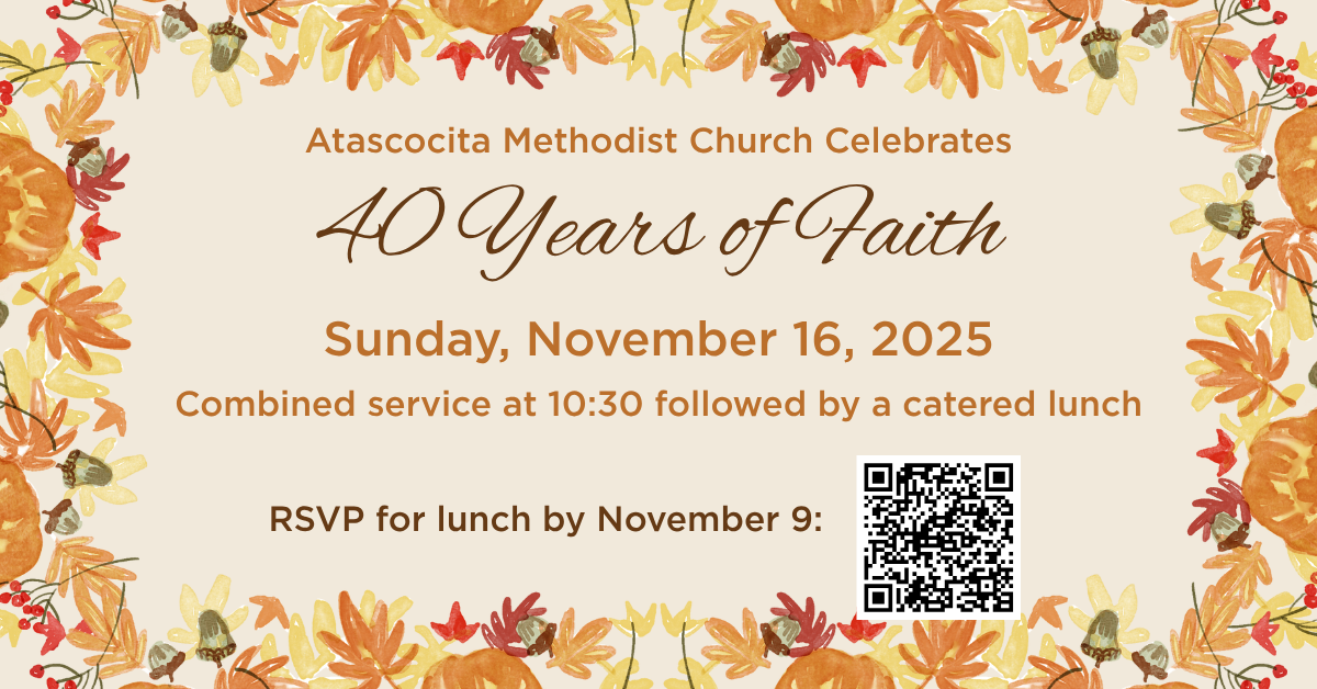 Atascocita Methodist Church and the WLC will be combining to celebrate our 40th and 35th year Anniversaries on Sunday, November 16th. There will be a special service at 10:30am followed by lunch in the gym. If you or any former WLC alumni you know, have photos to share with us from the past, please email them to me at beth@am-church.org. If you would like to come be a part of the celebration, please RSVP to the QR code in the information box included in this email for the lunch. It is important we have a count for the food.