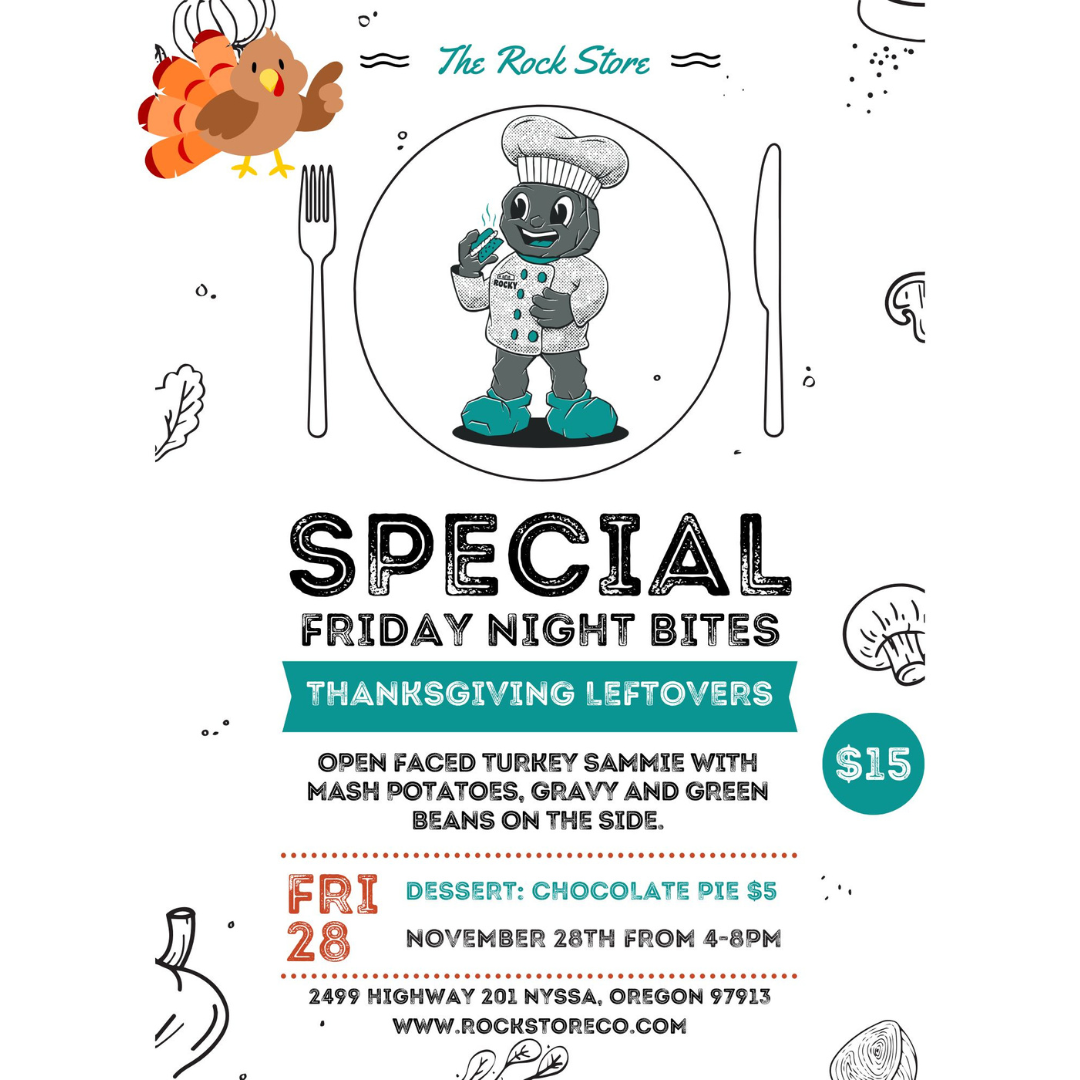 4:00 pm: Thanksgiving Leftovers Night at THE ROCK STORE - Nyssa