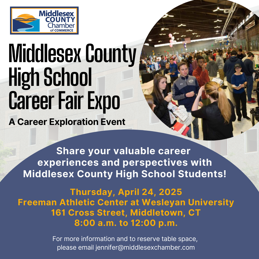 The chamber’s Business and Education Partnership is still looking for presenters for the annual High School Career Fair Expo- A Career Exploration Event, scheduled for Thursday, April 24 from 8:00 a.m. – 12:00 p.m. Whether you work in business, healthcare, skilled trades, manufacturing, the arts, STEM, government, or another sector, you are invited to present/ exhibit and share your valuable career experiences and perspectives with Middlesex County High School Students. *Please note, this is a career exploration event, not a hiring fair. To reserve a table space or to learn more, please contact jennifer@middlesexchamber.com.