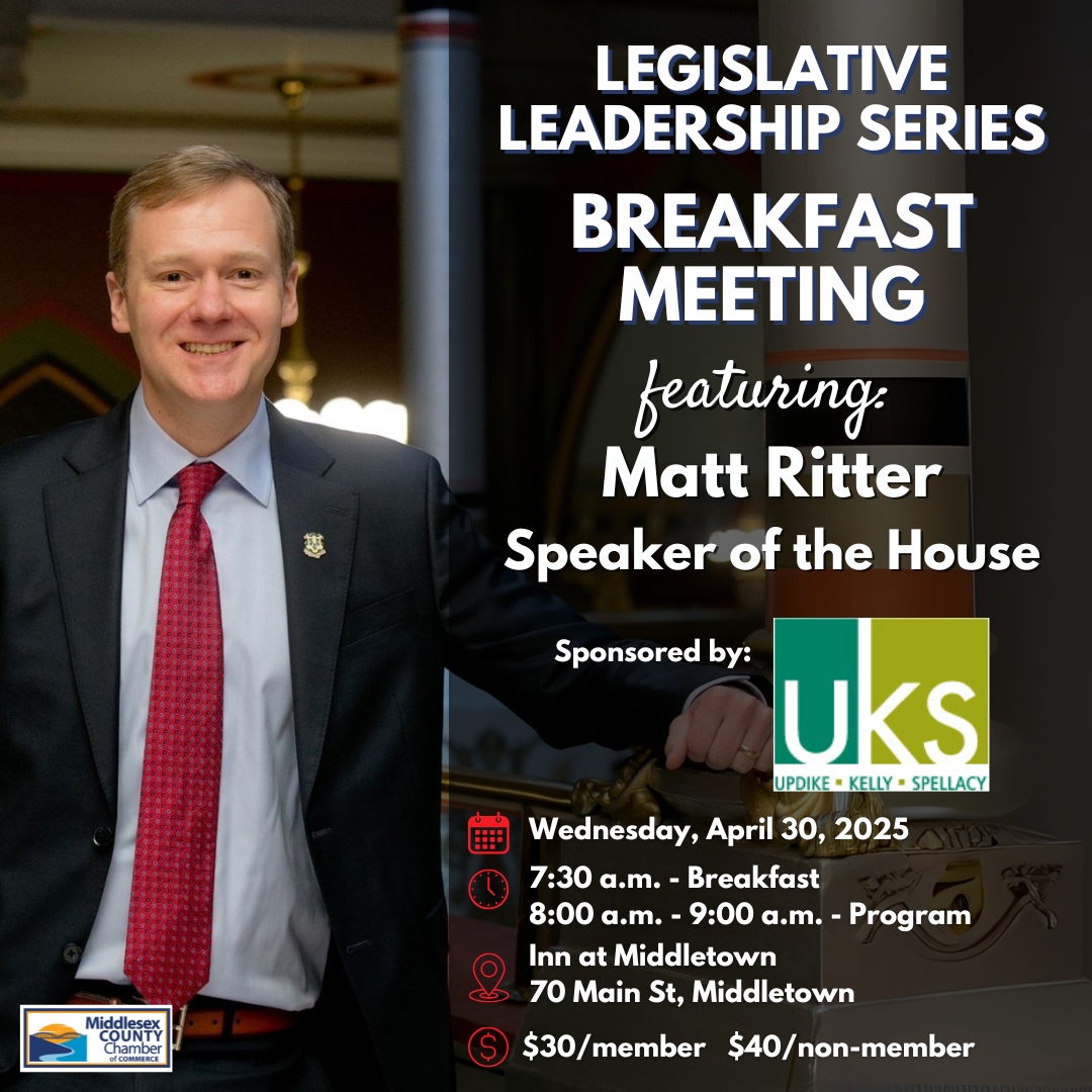 The following week, all are invited to join us for a Legislative Leadership Series Breakfast featuring Speaker of the House Matt Ritter on Wednesday, April 30 from 8:00 – 9:00 a.m. at the Inn at Middletown. At this special meeting, Speaker Ritter will visit with chamber members to discuss the 2025 Regular Session of the Connecticut General Assembly. A special thank you to Updike, Kelly & Spellacy for their continued support of our Legislative Leadership Series, and so many chamber programs. Click here to join us.