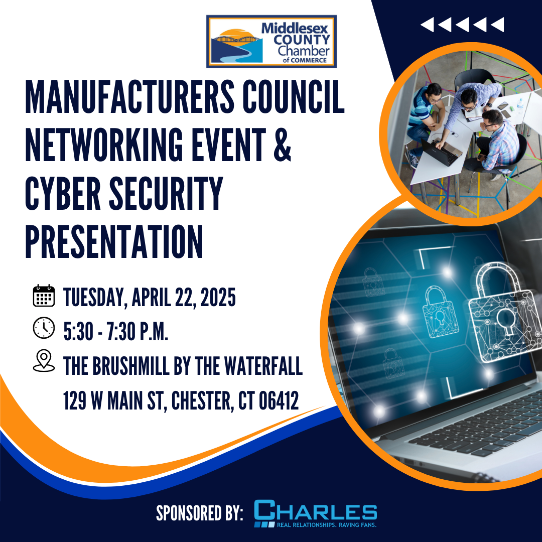 Next week, manufacturers are invited to a networking event and cyber security presentation by Charles IT on Tuesday, April 22 from 5:30-7:30 p.m. at The Brushmill by the Waterfall, Chester. Join the Middlesex Chamber’s Manufacturers Council for an evening of networking and a presentation on cyber security strategies in manufacturing. Click here to register.