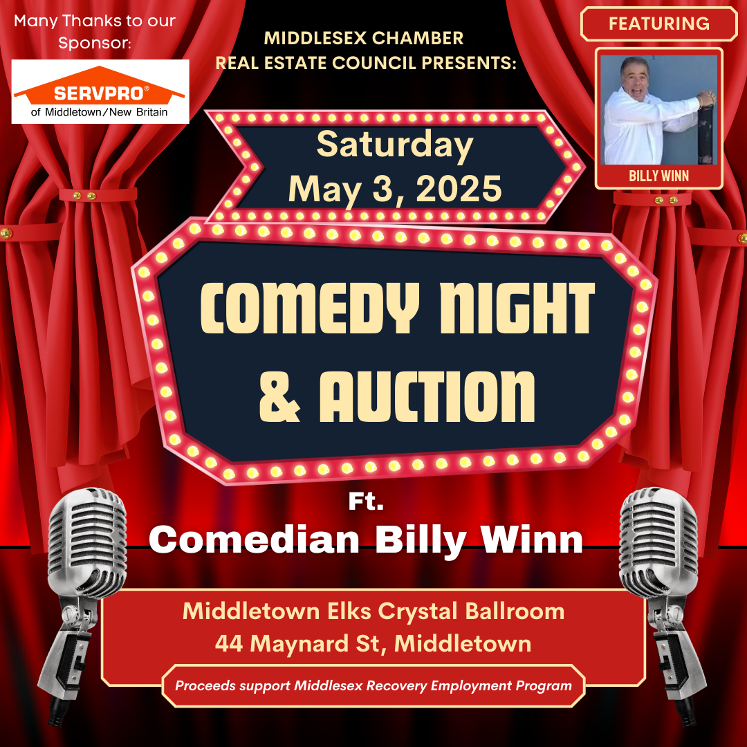 That weekend, get ready for an evening of laughs, auctions, and fundraising at our Real Estate Council's Annual Comedy Night & Auction on Saturday, May 3. This event, sponsored by ServPro of Middletown/ New Britain and Caleb Carney State Farm, will take place from 6:30 – 10:30 p.m. at the Middletown Elks Crystal Ballroom, and will feature comedian Billy Winn and guests as well as incredible silent and live auction items! All proceeds benefit the Middlesex Chamber Recovery Employment Program (REP) – a life-changing initiative helping individuals in recovery rebuild their lives through job coaching, placement, and life skills training.